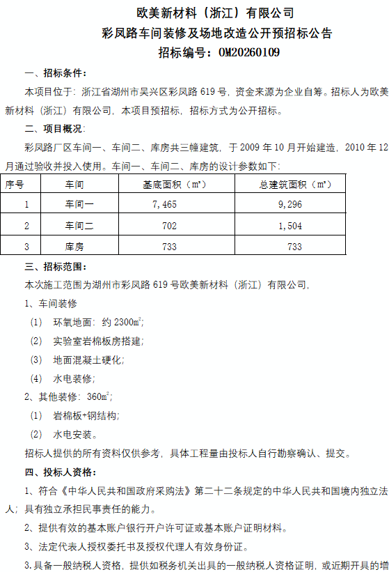 欧美新材料(浙江)有限公司 彩凤路车间装修及场地改造公开预招标公告